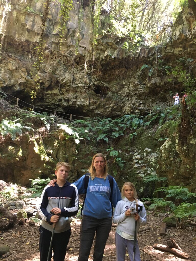 Zondag maken we een wandeling naar een waterval in het noord oosten van La Palma. Omdat we van de Blauwe Zwaan gehoord hebben dat je er ook onder kunt staan, wil Feija persé dat de zwemspullen mee gaan. En ze wil er ook écht onder staan (koud!)