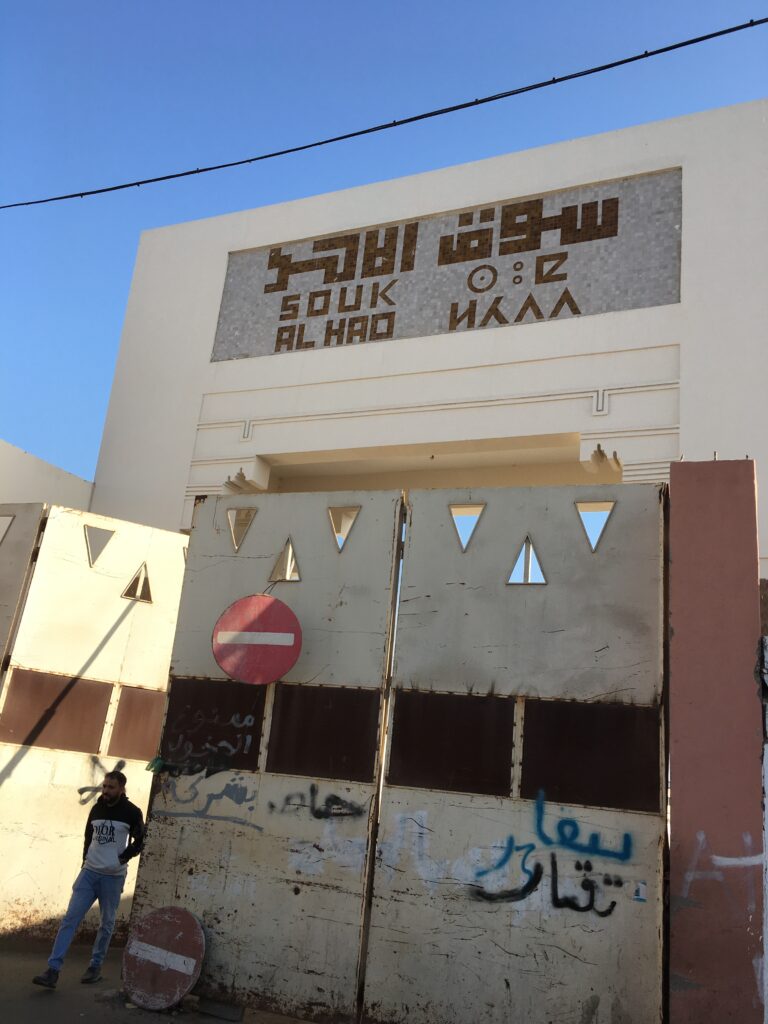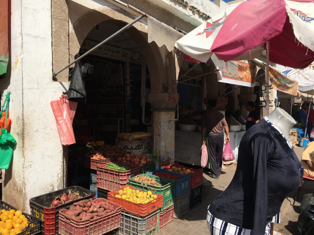 Lopend verkennen we de stad en bezoeken de (nieuwe) Soukh. Een enorm grote (open) markthal met 6000 winkels/ kraampjes waar je zo’n beetje alles kunt kopen. Wel wordt je hier (net als op het strand) als toerist continue aangesproken. Gelukkig wordt nee (non) als antwoord geaccepteerd en is men niet al te opdringerig. We kopen na wat onderhandelen een Marokkaanse theepot, glaasjes, thee en wat kruiden. Waarschijnlijk nog steeds voor een te hoge prijs, maar het is wel een ervaring De groente en fruitmarkt is heel uitgebreid en zeer goedkoop. Voor 3 dirham (30 cent) kopen we een kilo mandarijnen, voor 8 dirham (80 cent) een kilo bananen. Een (plat) brood is 1 dirham (10 cent) en komt vers van een van de vele kleine bakkerijen in de stad