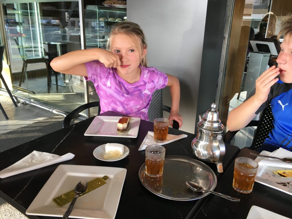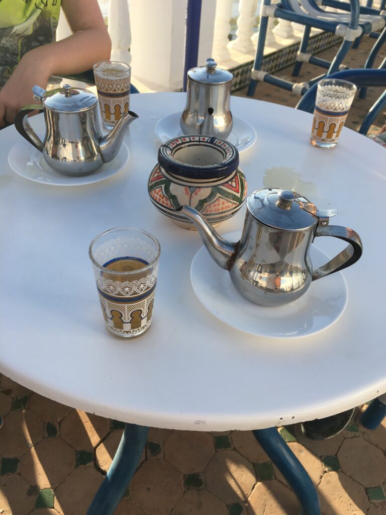 In Agadir ontdekken we de uit Frankrijk overgenomen ‘patisserie’ cultuur. Je zoekt een patisserie (taartje) of vinoisserie (zoet broodje) uit en bestelt een potje thé a la menthe (Marokkaanse whisky) en voor 25 dirham (ca 2,50 euro) per persoon kun je genieten. Ook kwamen we een patisserie tegen die zich had gespecialiseerd in taartjes met vers geperst sap. Ze hadden geen thee. Ook uit eten gaan is in Marokko zeer betaalbaar. We kunnen in toeristisch gebied voor 200 tot 300 dirham (20 tot 30 euro) met z’n vieren uit eten. Later komen we er achter dat het in het binnenland zelfs nog voor de helft kan. We koken dus niet veel aan boord