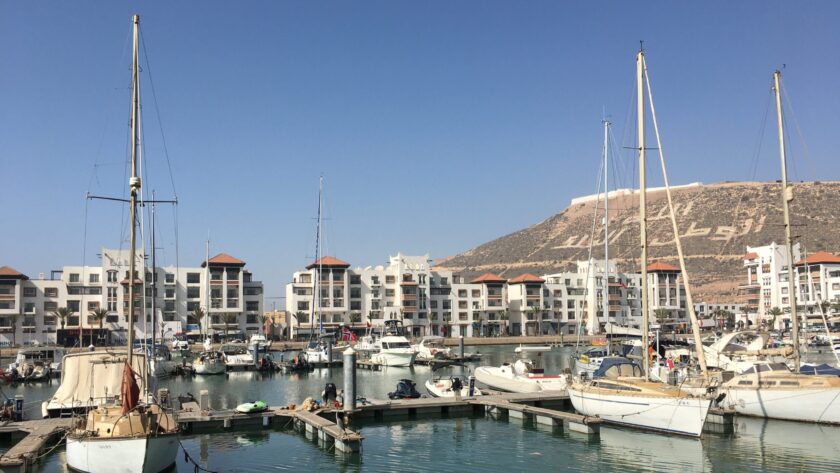’s Nachts zien we allerlei knipperende rode lampjes van de lokale (kleine) houten visserbootjes. Ook wordt het mistig. ’s Ochtens blijven we langzaam voor de kust varen tot de zon om een uur of 9:00 door de mist begint te komen. Om 9:45 varen de Marina Agadir binnen en worden vriendelijk ontvangen door een ontvangstcomité bestaande uit marina personeel, lokale politie, koninklijke politie en douane. Nadat de marina medewerkers hebben geholpen met aanleggen, komen de ‘officials’ aan boord om de bootgegevens en paspoortgegevens over te nemen. Ook werpt men een blik in de boot en wordt er gevraagd of er nog wat aan te geven is (nee). Na een uur zijn de plichtplegingen voorbij, en nog een uur later worden de gestempelde paspoorten langsgebracht. We mogen Agadir in!