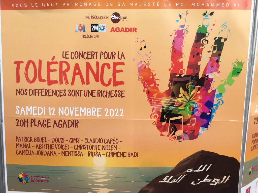 Omdat Marokko ons goed bevalt besluiten we wat langer te blijven. Hierdoor kunnen we meegenieten van ‘le concert pour la tollerance’, met verschillende artiesten waaronder Patrick Bruel. Tollerantie is het thema van de koning van Marokko, met als uitgangspunt dat ale bevolkingsgroepen, geloven en talen in Marokko (Arabisch, Berber en Joods) worden gerespecteerd. Een breuk met het beleid van de vorige koning, waarbij Berber niet geschreven mocht worden. Er wordt voor het concert een enorm podium op het strand opgebouwd, en ’s avonds kunnen we in de marina de muziek horen.