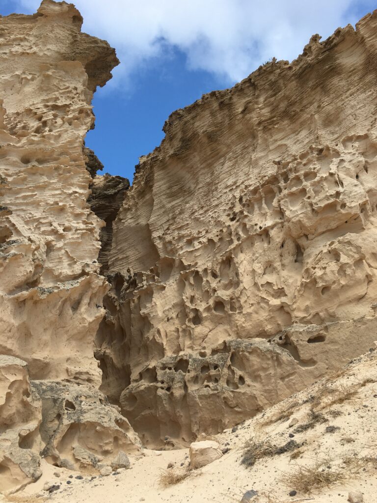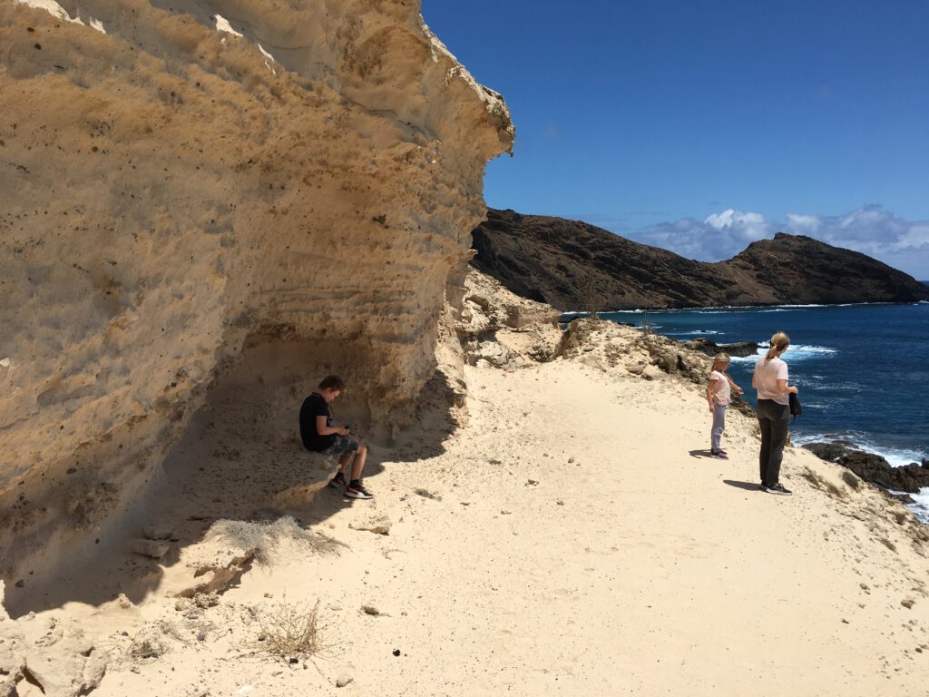 bestaat uit zandsteen (hier komt het strand vandaag). We klimmen via en trappetje